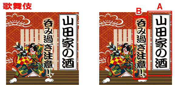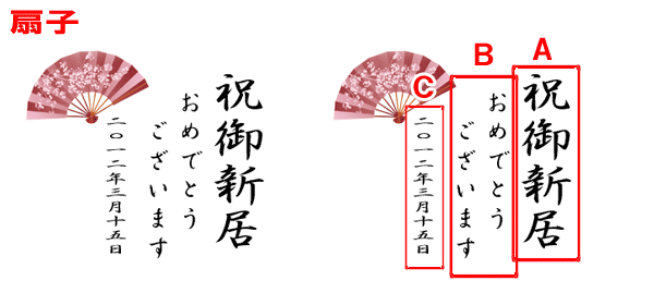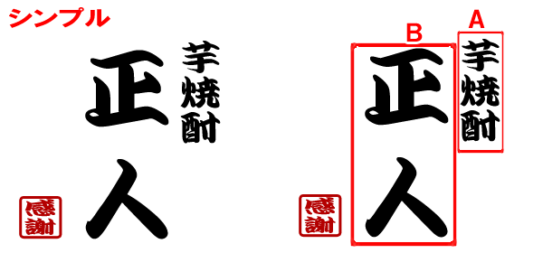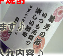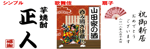【パターン シンプル・歌舞伎・桜の例】 A:芋焼酎(10文字まで) B:誠司(10文字まで) 【パターン 扇子・傘の例】 A:田中家の酒(10文字まで) B:幸せな家族を(10文字まで) 築いてください(10文字まで) C:平成二十四年三月吉日(日付以外でもOKです) 友人一同(10文字まで)