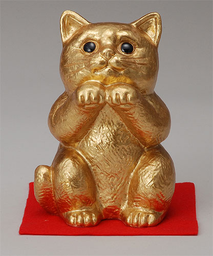 伝統的な信楽焼の置き物。金色の猫が幸せを運んできてくれそうな作品です♪