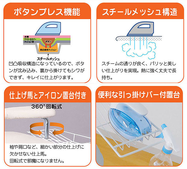 凹凸クッションにより、ボタンが中に沈み込み、スムーズなアイロン掛けが可能!
