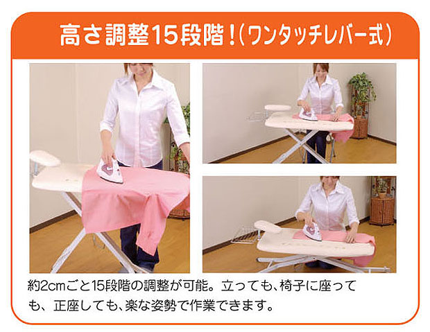 袖や肩口など、細かい仕上げが仕上げ馬でできます。また、高さ調節が15段階と細かく指定ができ、座ったままは勿論、立ったままでもアイロン掛けができます!まさに機能的でとっても便利でオシャレなアイロン台です☆